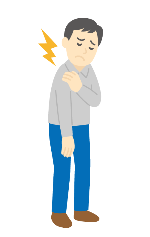 肩の痛みや肩こりで辛そうな表情の男性のイラストなので、