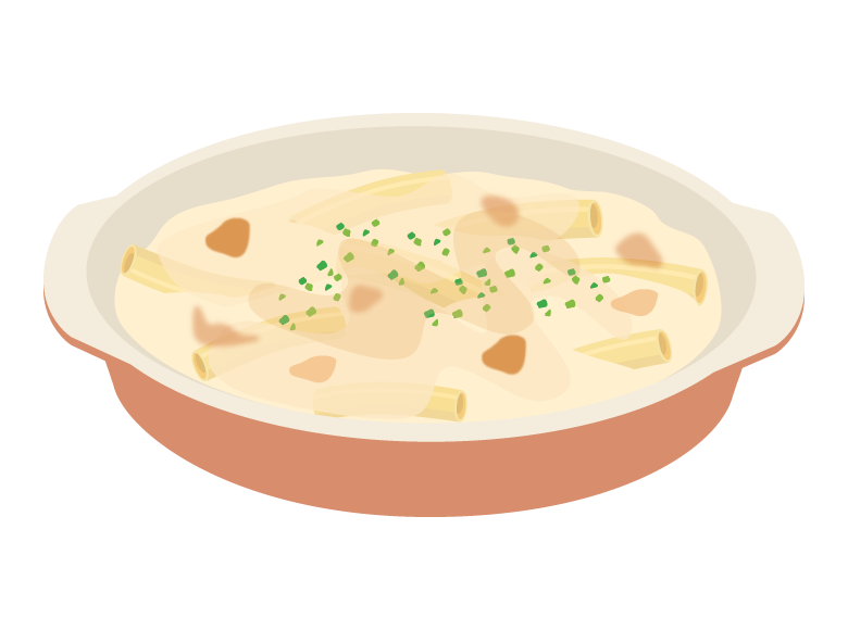 日本でも親しまれている洋食メニューのマカロニグラタンのイラストなので、